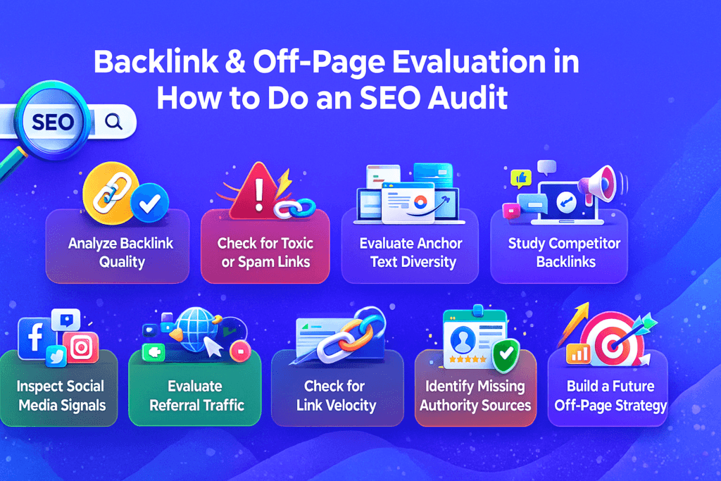 Off-page SEO is a powerful part of learning how to do an SEO audit, because it reflects how other websites view and trust your content. Strong backlinks, brand signals, and online authority help search engines understand your site’s credibility and relevance.